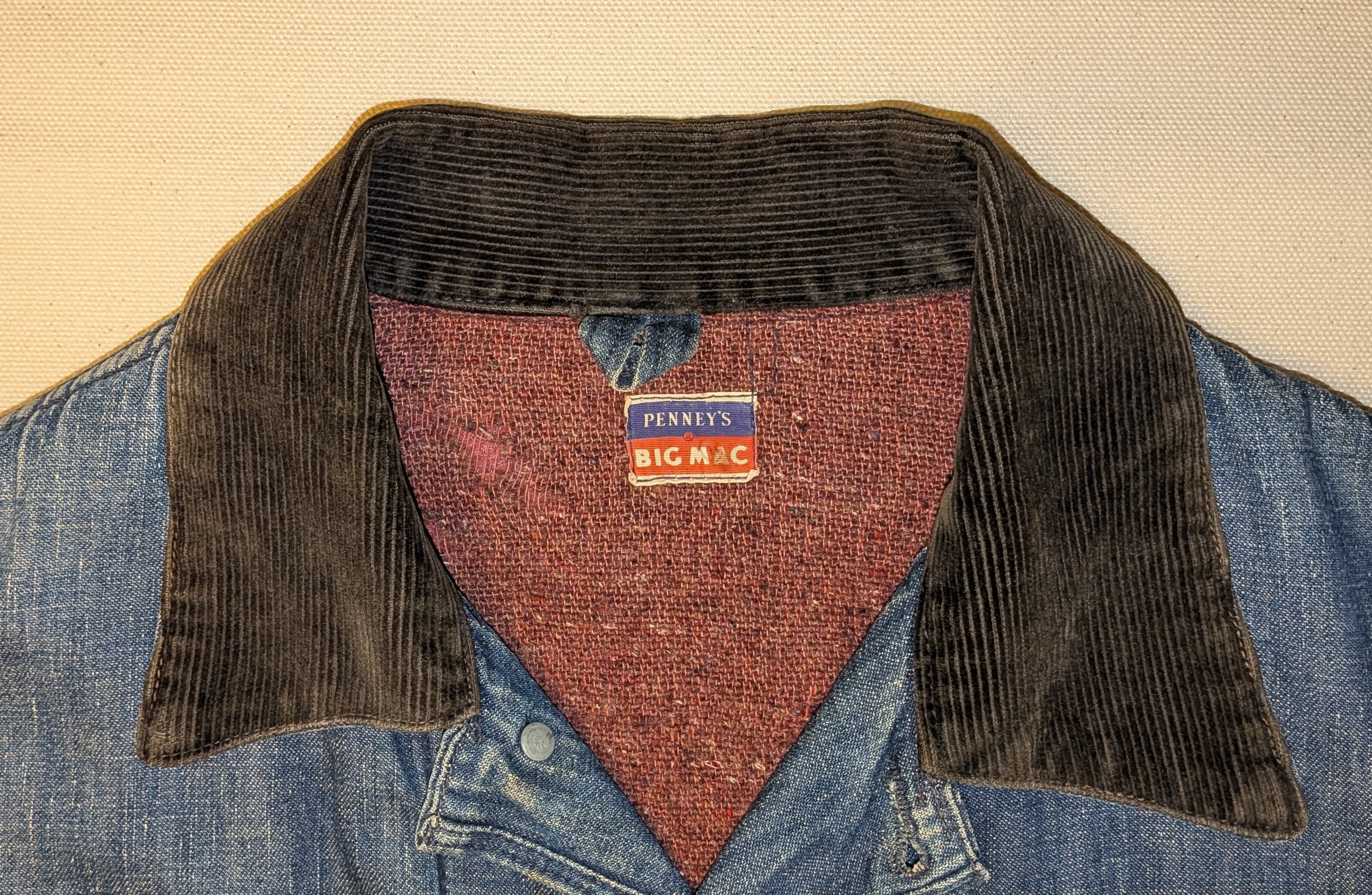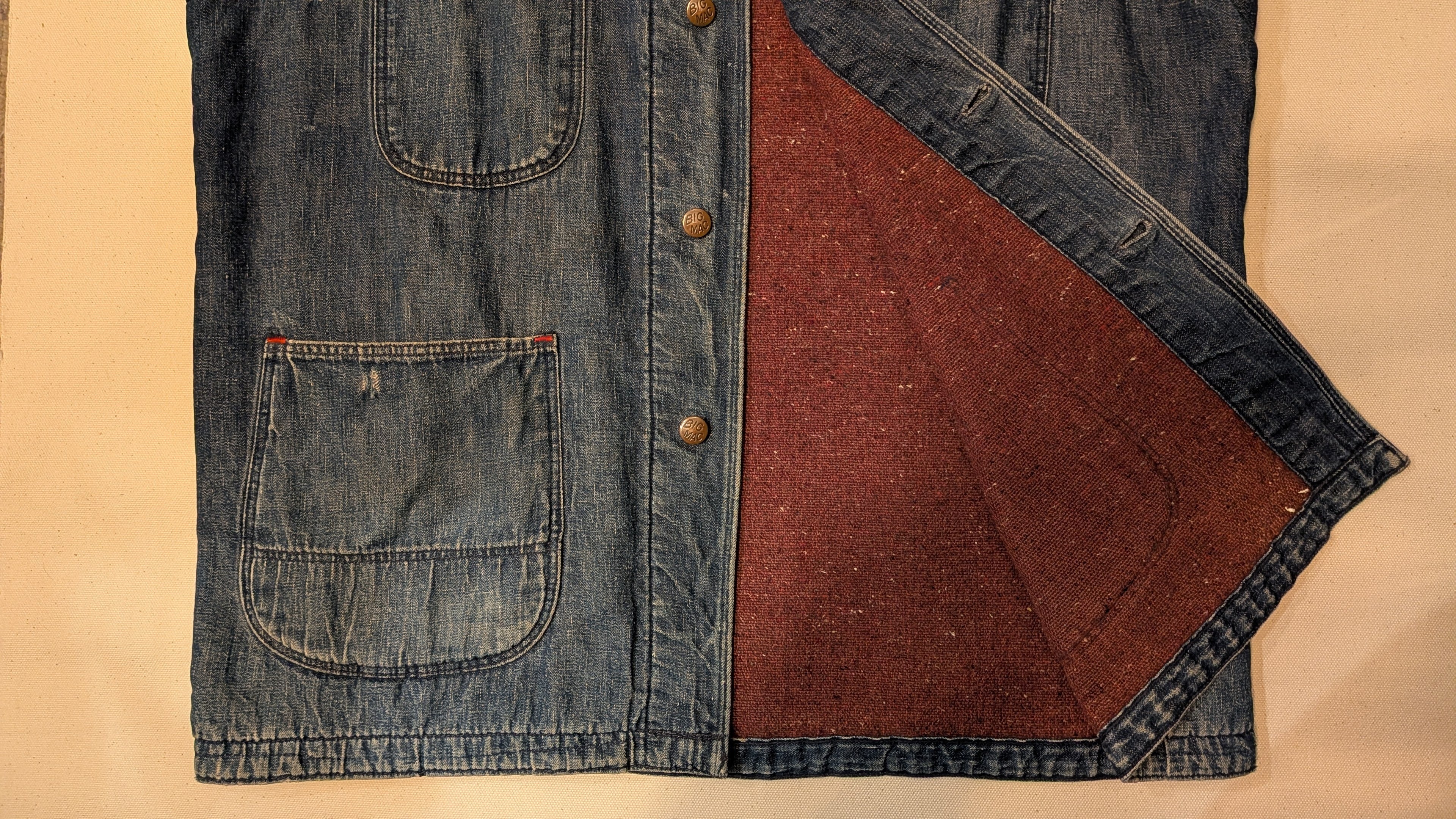 ブラウンのコーデュロイ襟、赤ブランケットライナー、BIG MAC刻印ボタン、赤カンヌキ補強など、当時のワークディテールがしっかり残る一着。