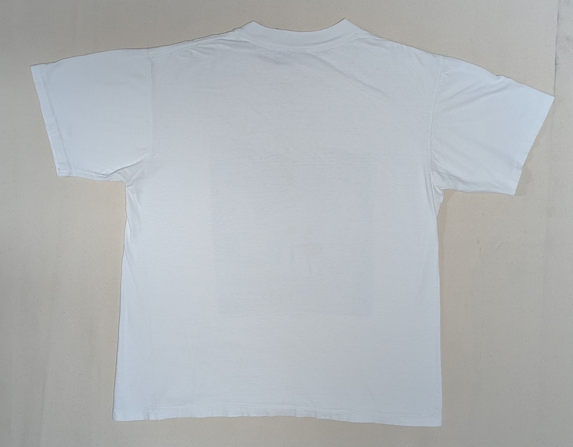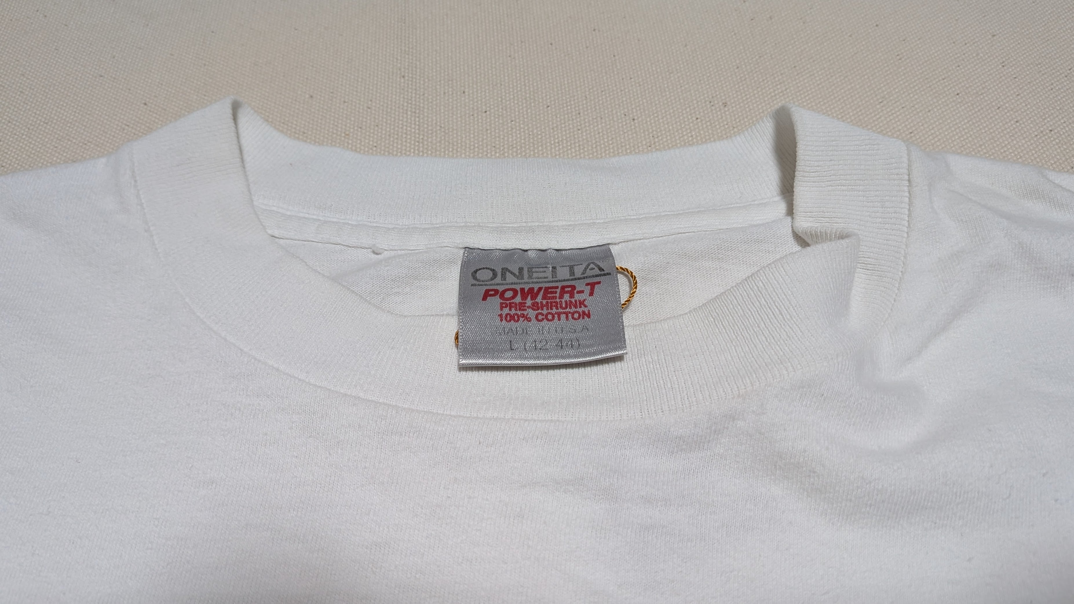 ボディはONEITA POWER-T、USA製。しっかりとしたコットン生地で、当時らしいタフな作り。ホワイトボディに大判プリントが映えるバランスの良いデザインです。